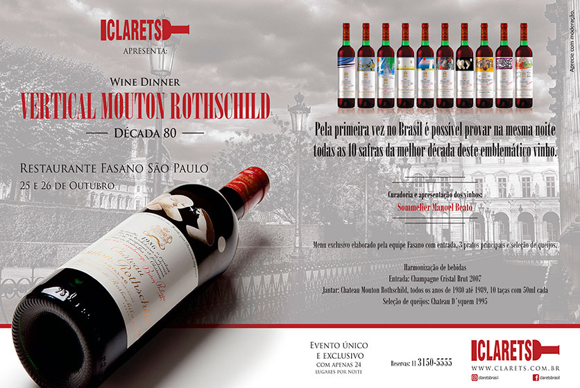 Sucesso retumbante, Wine Dinner com vertical de dez safras de Château Mouton Rothschild. Evento da Clarets no Hotel Fasano, que reuniu as dez safras da década de 80 do Château Mouton Rothschild, foi um grande sucesso. Evento da Clarets no Hotel Fasano, que reuniu as dez safras da década de 80...