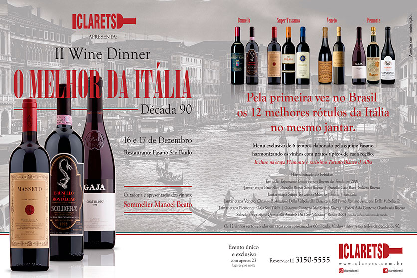 O melhor da Itália em dois Wine Dinners especiais.Evento da importadora Clarets e do Hotel Fasano reúne o melhor da enogastronomia italiana em dois jantares exclusivos. Imagine um jantar com os melhores pratos da cozinha italiana harmonizados com os 12 melhores e mais consagrados vinhos da Itália! E mais: com...